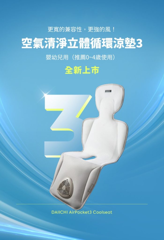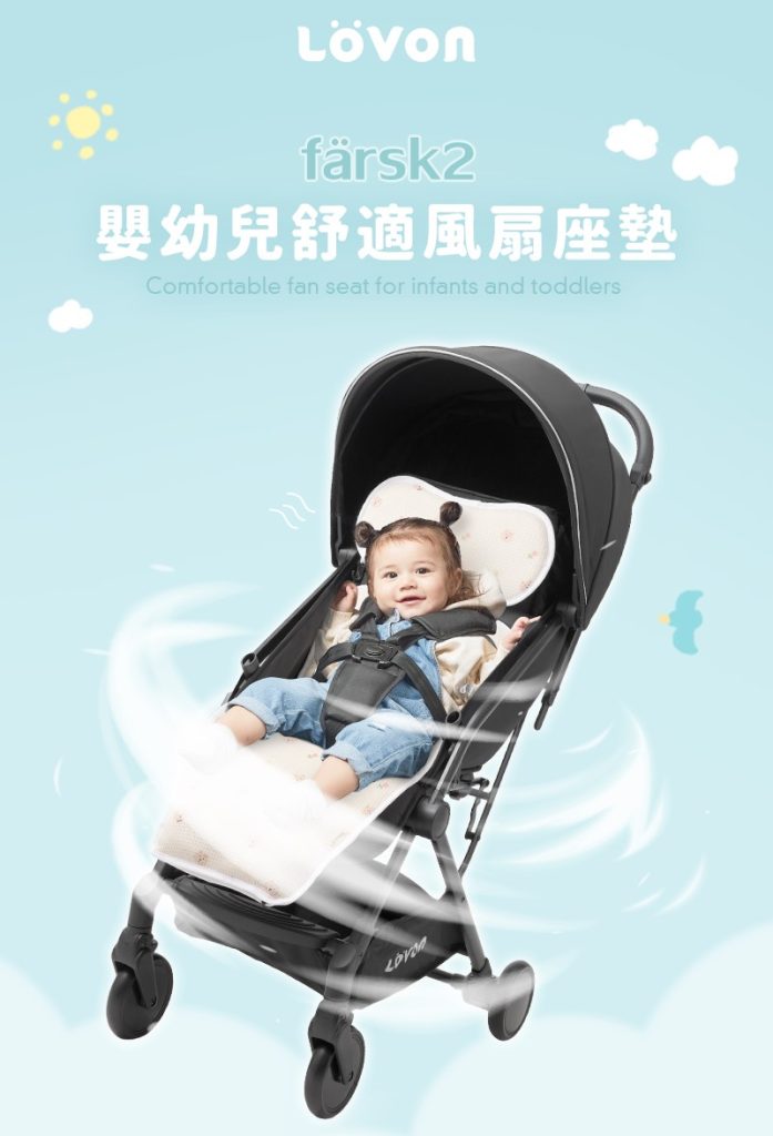 前置風扇的風道專利設計,讓風量更大(但較易踢到),通過韓國KC電磁波檢驗合格,防潑水、耐用的滌綸材質方便清潔,拆掉風扇便能水洗,加厚的涼墊讓寶寶像坐在雲朵一般,特別設計了他牌沒有的三段定時功能(15/30/60分),避免小孩長時間吹風。